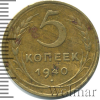 2573 5 копеек 1940 Br VF/XF kagan 22 111 Закрыто