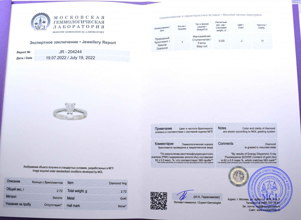Кольцо с бриллиантом (0,50 карата). Золото 585 пробы. Вес - 2,72 гр., размер - 17. Экспертное заключение МГЛ.