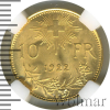 2075 10 франков. Швейцария 1922 Au MS 65 choko62 53 57 802 Закрыто