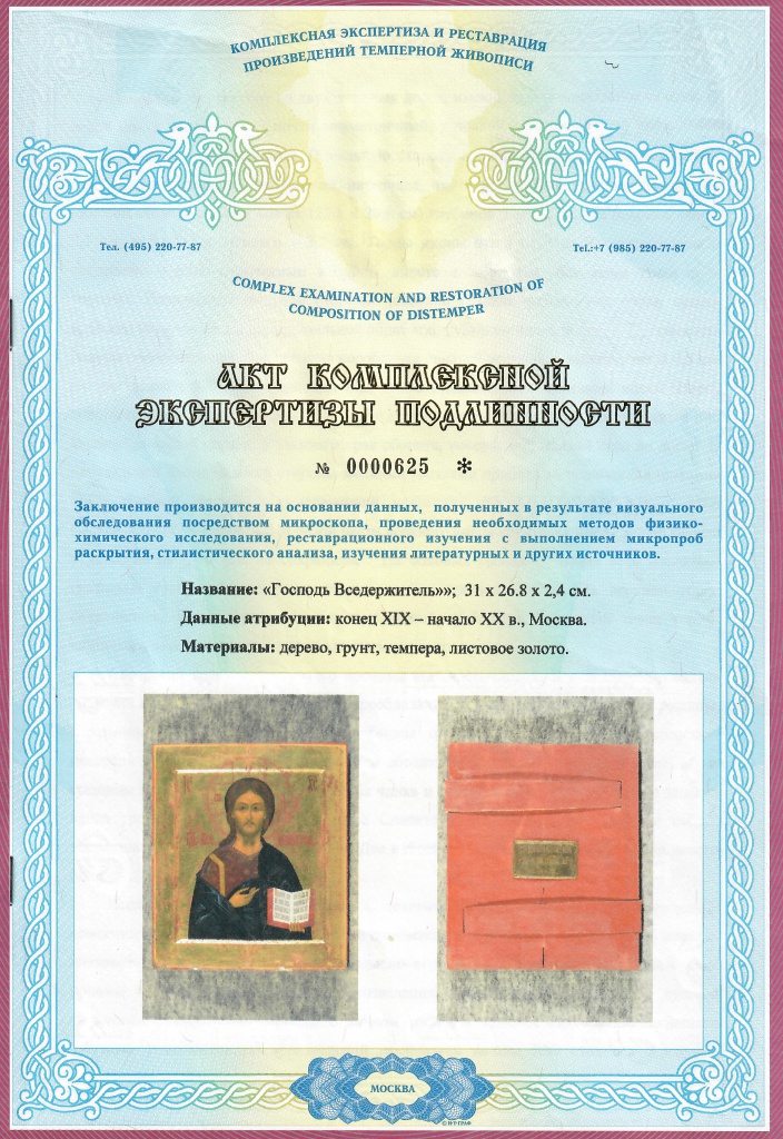 Икона "Господь Вседержитель". Дерево, левкас, темпера, сусальное золото. Размеры: 31 х 26.8 х 2,4 см. На оборотной стороне иконы табличка с надписью на старославаянском языке "СЪ БЛАГОСЛОВЕНІЕ ОТЪ СВЯТѢЙШАГО СѢЙ СИНОДА."