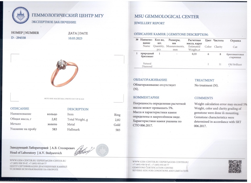 Сертификат Геммологического Центра МГУ.