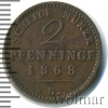 1398 2 пфеннига. Пруссия. Германия 1868 В Br XF+ НачШтаба 48 419 Закрыто