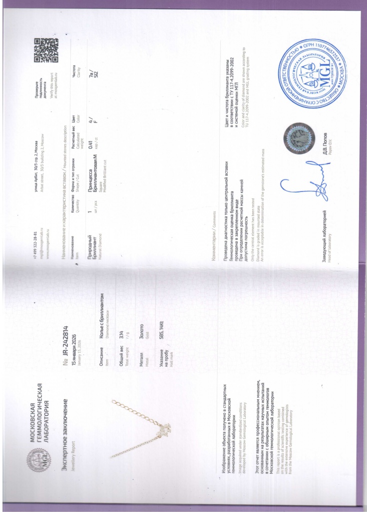 Колье с бриллиантами (0,41 карата). Золото 585 пробы. Вес - 3,14 гр., длина - 45 см. Сертификат MGL.