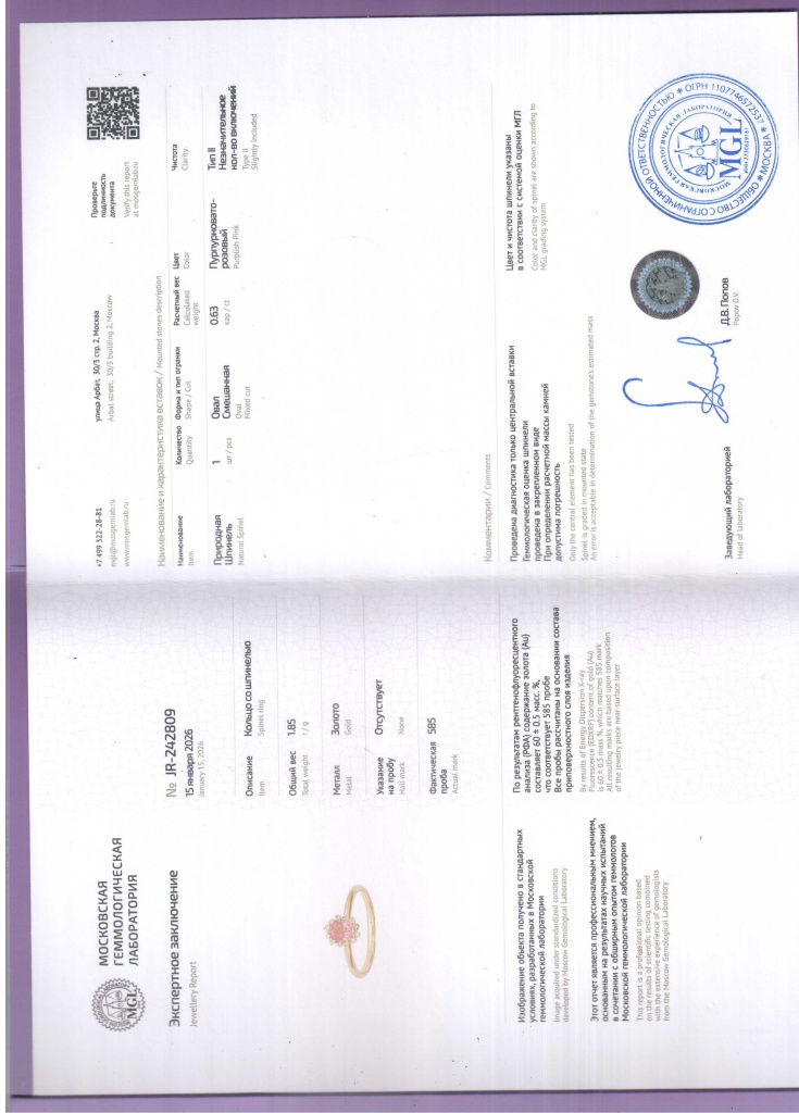 Кольцо со шпинелью и бриллиантами. Золото 585 пробы. Вес - 1,85 гр., размер - 17. Сертификат MGL.